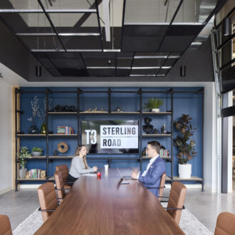 The JBG Crystal City fitness center blends wellness and branding through a spa-inspired environment and light-filled design. Group fitness, meditation rooms, and toilet areas evoke a calming, hospitality-forward atmosphere, with recessed lighting and a warm material palette enhancing the sense of retreat. The main fitness area embraces transparency and connection to nature, with floor-to-ceiling frameless glass that brings in abundant daylight and expansive views. A full wall of custom mirrors reflects the surrounding greenery, further blurring the lines between indoors and out. The color palette reinforces JBG’s brand identity while aligning with the overall architecture of the building, creating a cohesive and elevated experience.