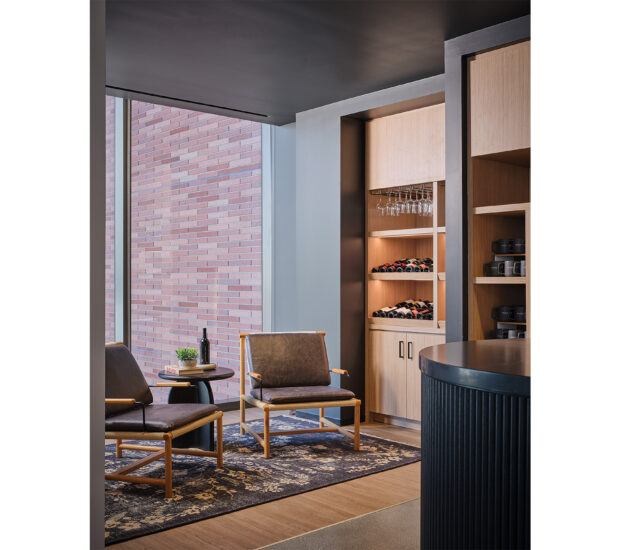 The office features unexpected elements like a cozy fireplace and a wine bar, showcasing Wilson Dow’s hospitality and extensive wine collection. Theater-inspired curtains and drapery play a pivotal role, creating moments of reveal and adding drama while modulating natural light and providing privacy.